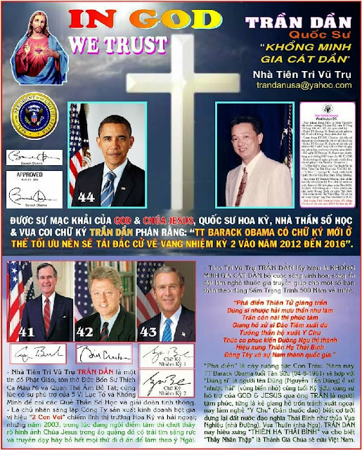 Nhà Tiên Tri Vũ Trụ TRẦN DẦN là ai, xin xem qua lời Chúc Mừng TT Barack Obama được ông gởi đăng trên các báo tại Nam và Bắc California dịp Tết Tân Mão 2011 sắp tới. Nhiều mẫu in tương tự ông đã cho đăng liên tục trên các nhật báo và tuần báo xuất bản tại Nam California trong nhiều năm qua, nhất là dưới thời TT George W. Bush khi ông đề nghị TT George W. Bush (Bush con) phải thay đổi chữ ký để có thể đắc cử nhiệm kỳ thứ 2 từ 2004 đến 2008. Sự thật như thế nào, xin đón đọc bài tiếp theo phỏng vấn Nhà Tiên Tri Vũ Trụ Trần Dần tự “Quốc Sư Hoa Kỳ”, Nhà Thần Số và là “Khổng Minh Gia Cát Dần”. Chuyện lạ?